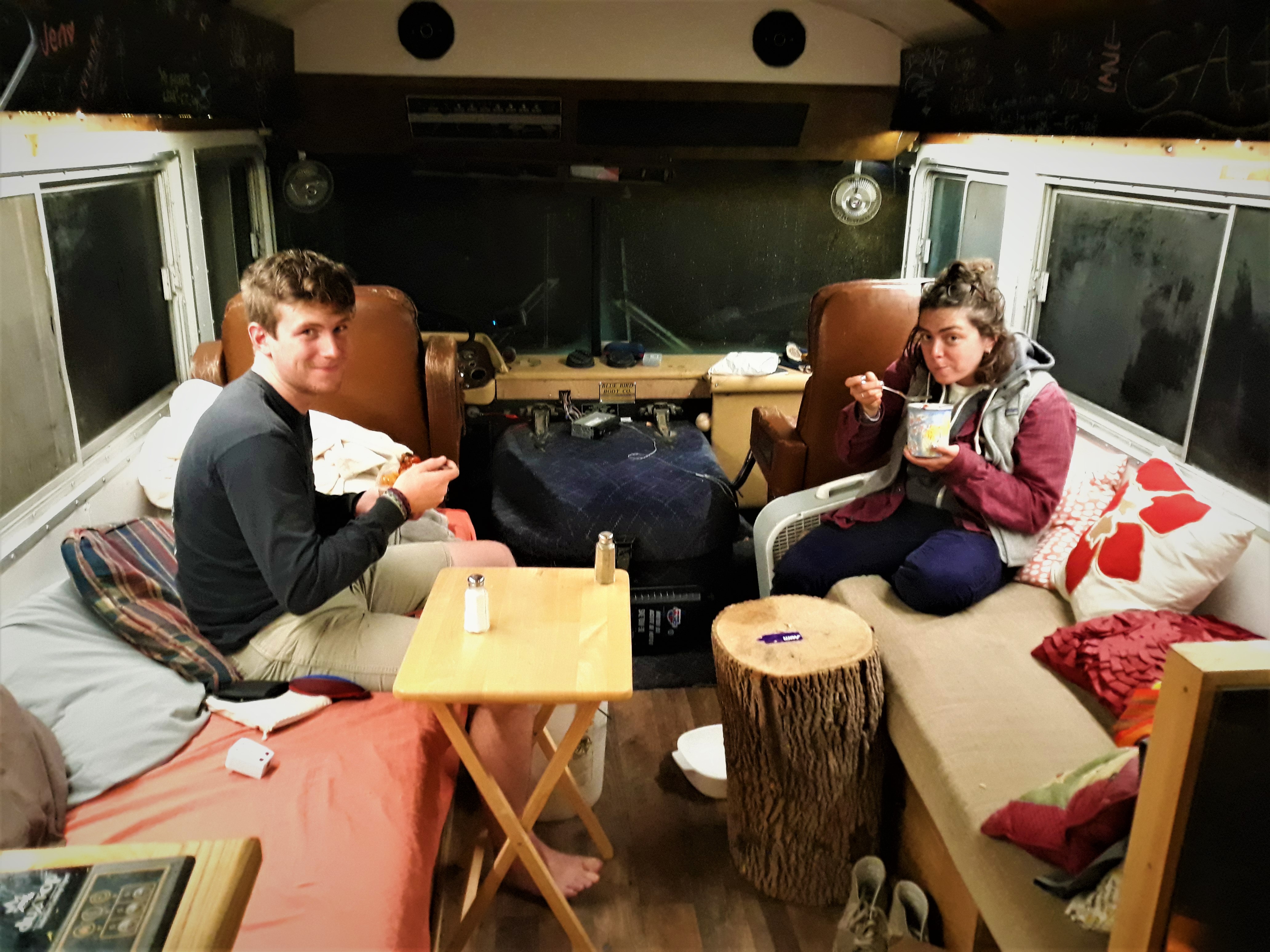 Around 10 AM the next we were off to Chicago to pick up our now 2 missing friends. We hung out in a Walmart parking lot for a couple hours because we can’t just drive this 31 foot long bus into the city. Eventually our friends Lee and Dylan showed up and we could get this party on the road. After driving for a couple hours we settled down somewhere in Illinois or Wisconsin and we had our first night all together. This night looked like many of the nights that would follow: someone would hook us up to the electricity and water (if that was available), someone would go on the roof to get the chimney up and start the fire, 2 would start cooking dinner and one of us would fill up all the water bottles and water that we needed for cooking.