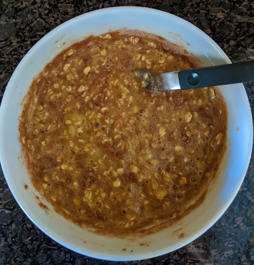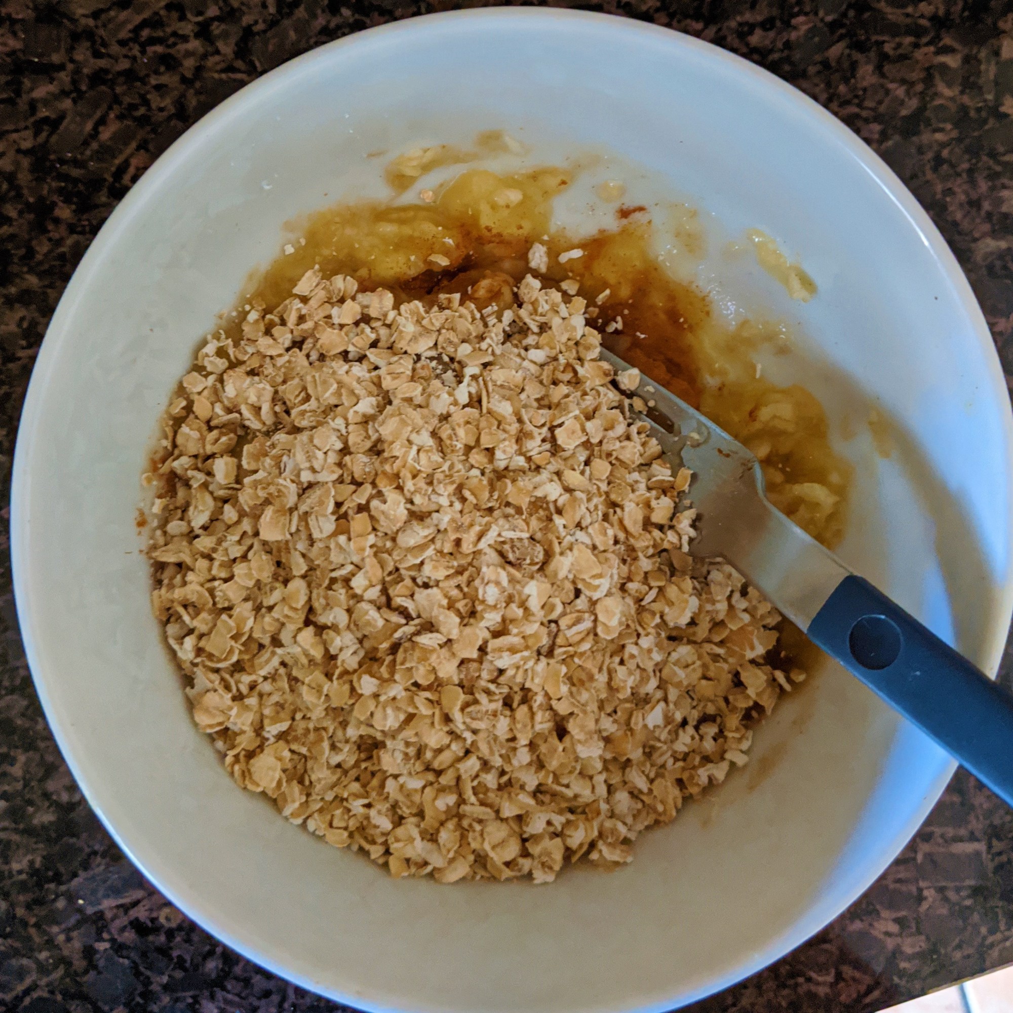 Step 3 & 4: Add the oats to your cinnamon and banana mixture but don’t stir it in yet. Add both eggs and then mix everything up together. Make sure that the eggs are mixed in well