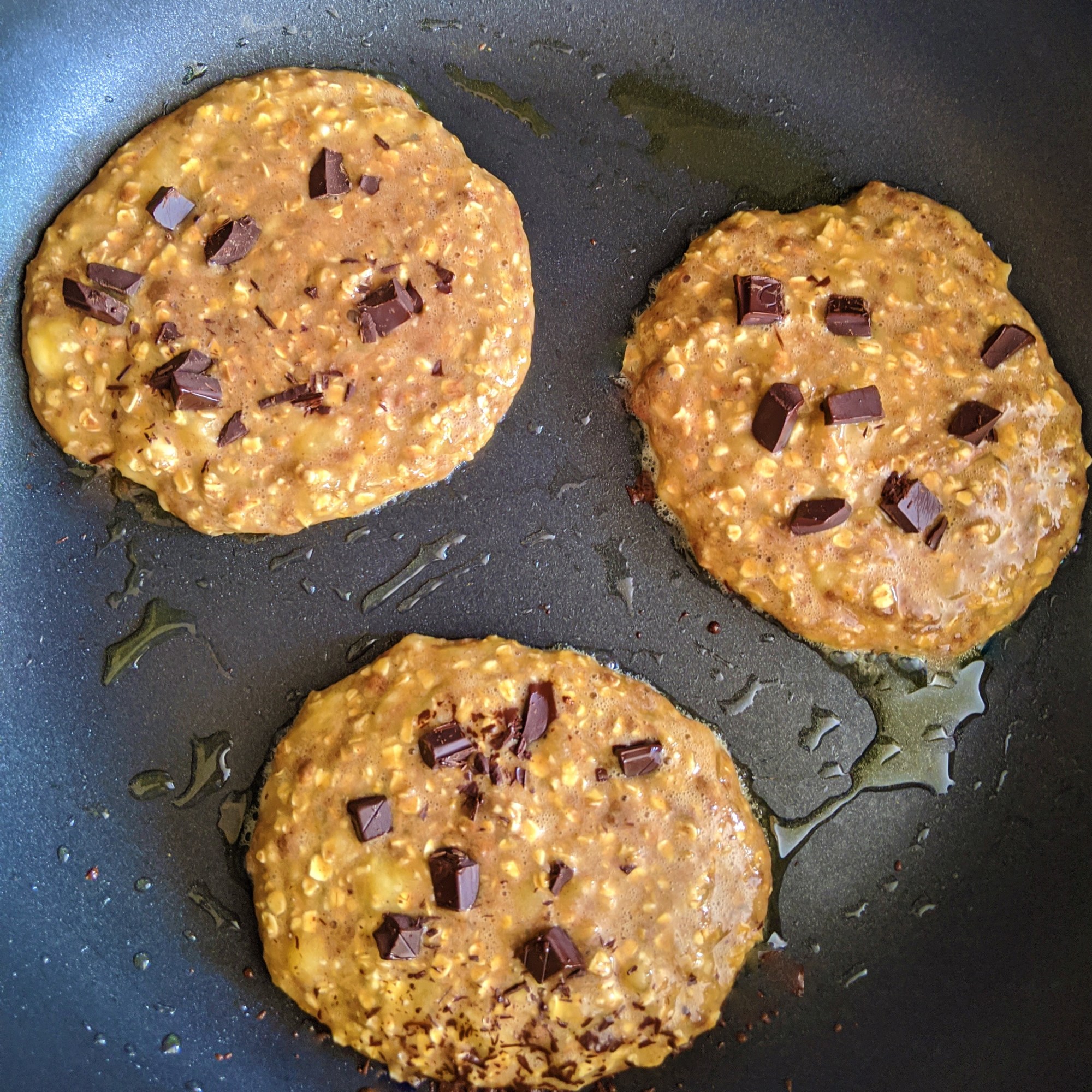 Step 6– make the pancakes: preheat your pan and make sure that it’s hot enough that your pancakes starts cooking as soon as it hits the pan. I like to do one side a little bit longer than the other. I like to bake them 2-3 minutes on one side and than 1-2 minutes on the other side. Add in the dark chocolate chunks before flipping your pancakes over. Never ever flip your pancakes more than once.