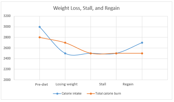 This is a typical crash diet graph. You can see towards the end that the blue line is rapidly going back up to where it started off.