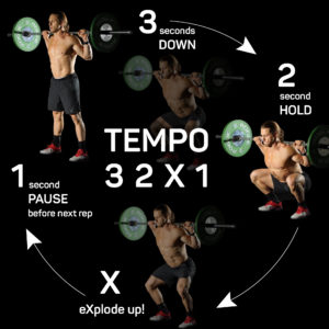 - 10 tempo push-ups (tempo: 3 second down, dead stop at the bottom, 3 second to the top)